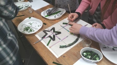 Unter fachkundiger Anleitung durch Bernd Kriegisch vom Glas-Stad´l bastelten wir Schmelzglas-Objekte für den Gang im ersten Stock. Mit Glasschneidern knipsen wir Kristallglas so, wie wir es brauchen zurecht und arbeiten Nuggets, Granulat und bunte Glasperlen mit ein.